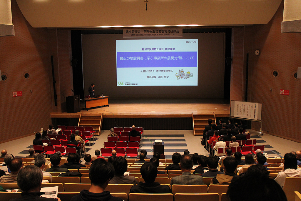 令和7年11月13日(木)中央文化センターにおいて、公益財団法人市民防災研究所の江原信之氏を講師としてお招きし、「最近の地震災害に学ぶ事業所の震災対策について」をテーマとした講演会を実施しました。